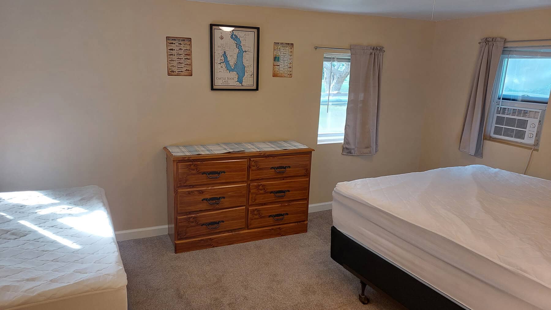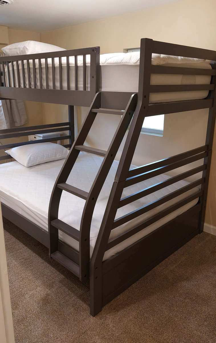The main bedroom features a queen bed and full bed, the second bedroom has a full bed and twin bed in a bunk bed —perfect for families or friends.