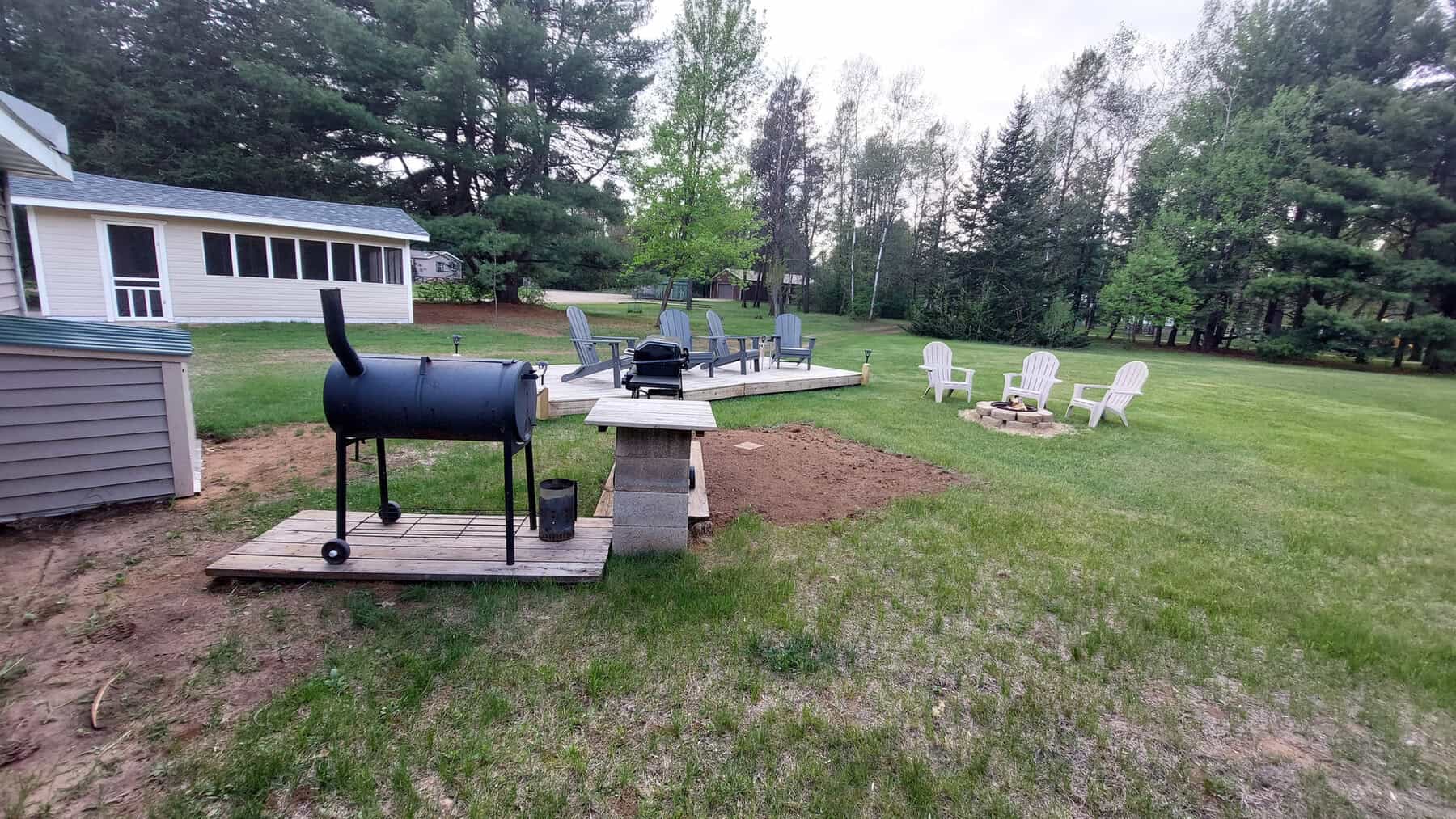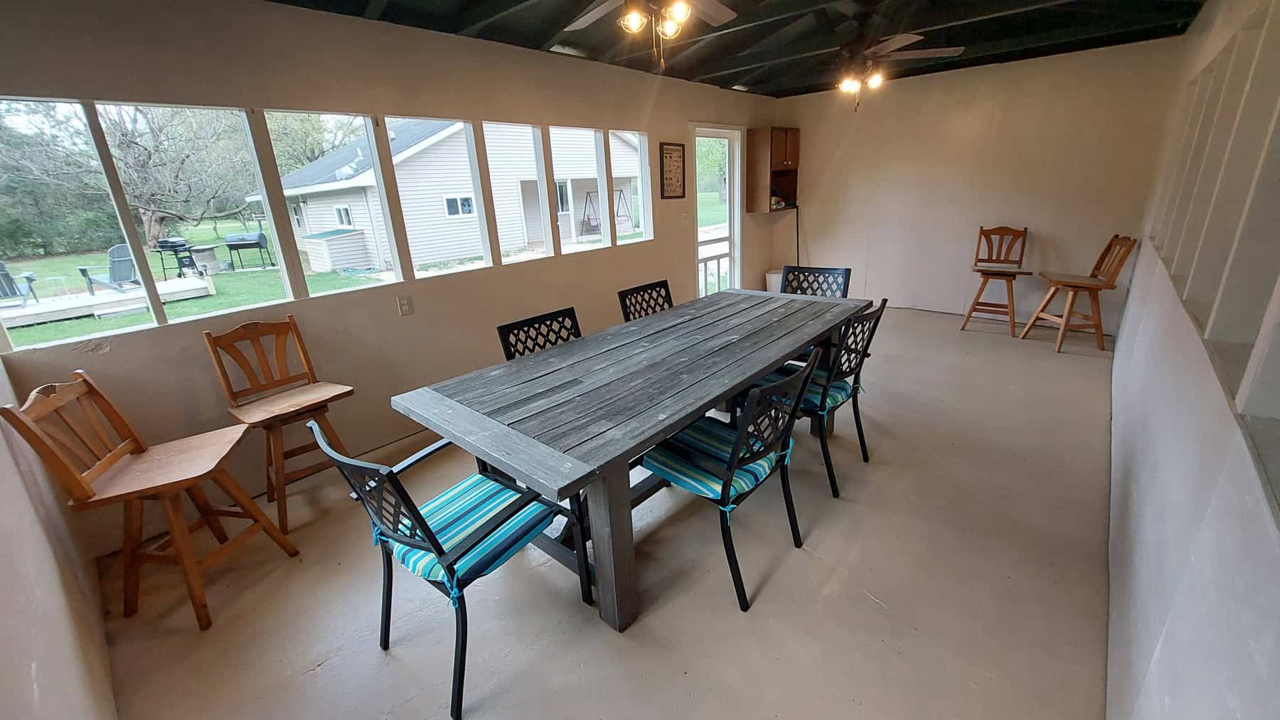 Step outside and relax! The Winding River Retreat features a private yard with a gas grill, a charcoal smoker, outdoor chairs, and your own campfire pit for s’mores and starry nights. The one-car garage has been transformed into a rustic screened porch—perfect for unwinding after a day of exploring. Enjoy bug-free evenings with a breeze, a ceiling fan, and the peaceful sounds of nature.