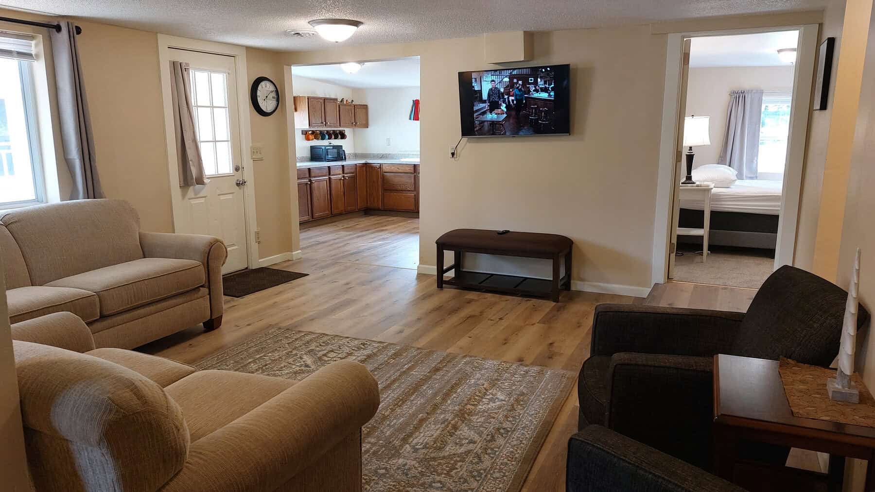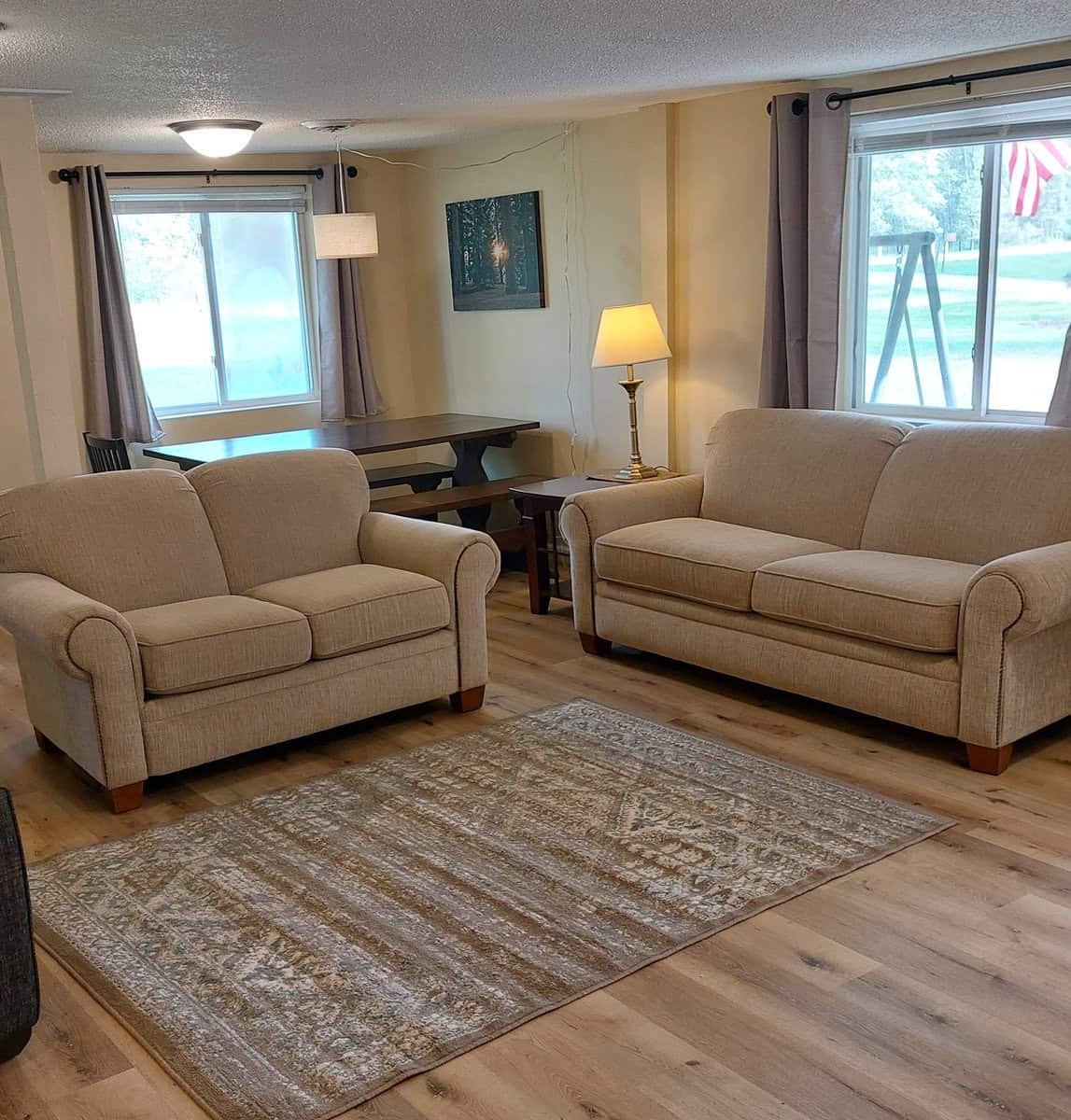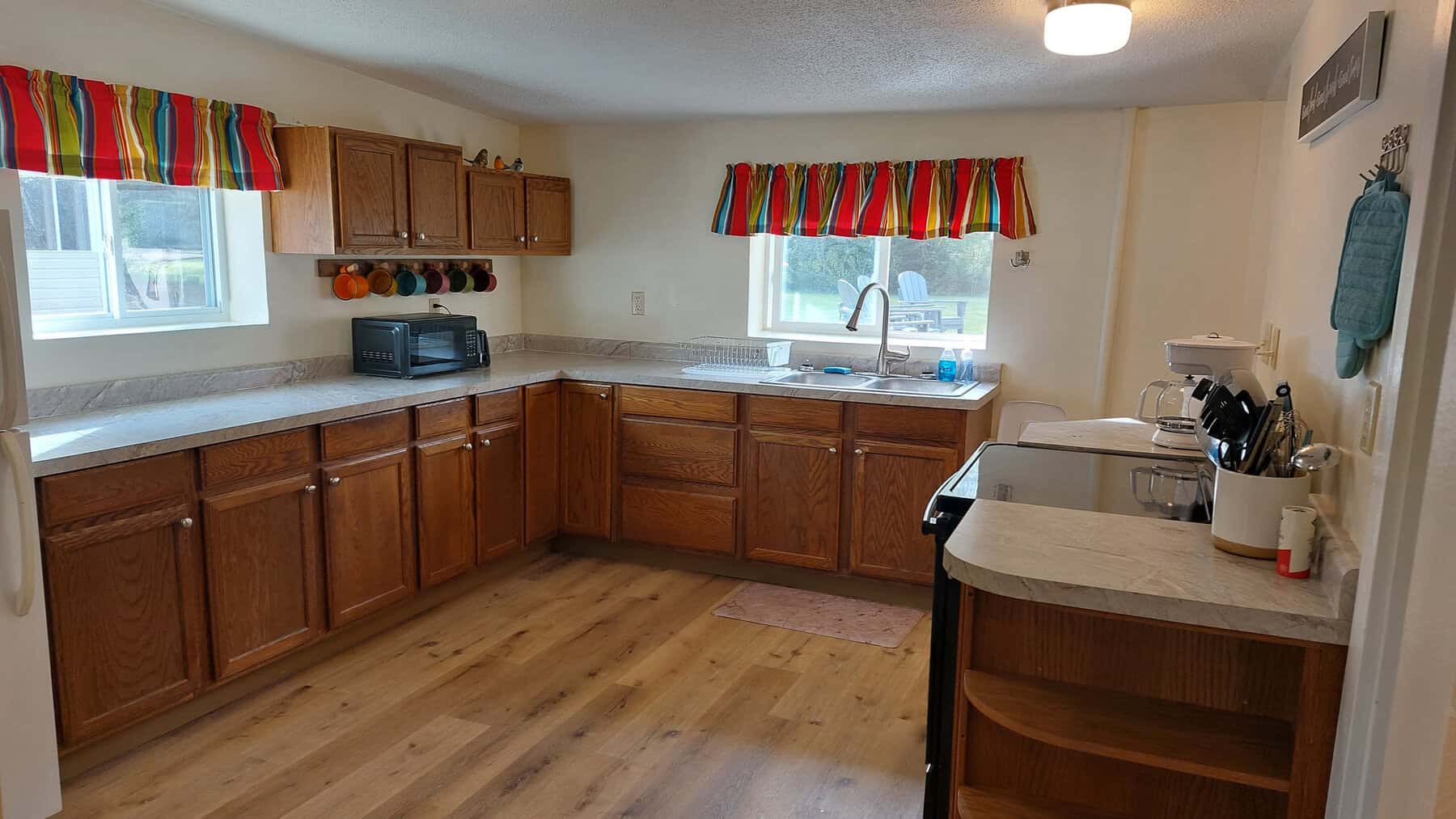 Inside the Winding River Retreat, you’ll find a fully furnished, freshly remodeled two-bedroom home designed with comfort in mind. The kitchen is stocked with the basic cookware and utensils, ready for easy meals, and the open living area has comfy seating for relaxing after a day outdoors. You’ll also find a full bathroom with a tub/shower combo guest use.